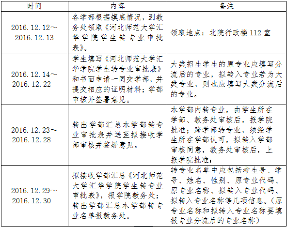 根据《兴发个人中心登录通道学生学籍管理规定》第三十四条、三十五条规定,为做好本学年学生转专业工作,保证转专业的各项工作有序进行,请各学部按照规定程序,按时做好各项工作。现将有关事项通知如下: 一、申请转专业的条件 第三十四条 符合下列情况之一的,可允许校内转专业: (一)确有专长,转专业更能发挥其特长的; (二)学生入学后发现某种疾病或生理缺陷(不含隐瞒既往病史入学的),经校医院或学校指定的二级甲等以上医院检查证明,不能在原专业学习,但尚能在其他专业学习的; (三)确有某种特殊困难,不转专业无法继续学习的。 第三十五条 有下列情况之一的,不得申请转专业: (一)入学未满一学期的; (二)本科三年级及三年级以上的; (三)正在休学、保留入学资格、保留学籍的; (四)应当予以退学的; (五)在校期间违反校规校纪受处分的; (六)按照普通高校招生考试类别,文科、理科、艺术类、体育类等互转的(文理兼招专业除外)。 二、转专业要求及程序 1.学生转专业,应由学生本人向所在学部提出申请,填写《兴发个人中心登录通道学生转专业审批表》(一式三份),报学部审核签署意见后,由转出学部汇总并送至拟接收学部。 2.拟接收学部汇总《兴发个人中心登录通道学生转专业审批表》,签署学部意见后,报学院教务处。 3.转出学部汇总本学部转专业名单报教务处。名单中应包括考生号、学号、姓名、性别、原专业代码、原专业名称、拟转入专业代码、拟转入专业名称等几项信息。(原专业名称和拟转入专业名称应填报专业分流后的专业名称)。教务处联系人:白玮,联系电话:80785812。 4.学院教务处审核各学部《兴发个人中心登录通道学生转专业审批表》,并汇总各学部转专业名单、公示,无异议后,报学院批准。 三、具体时间安排