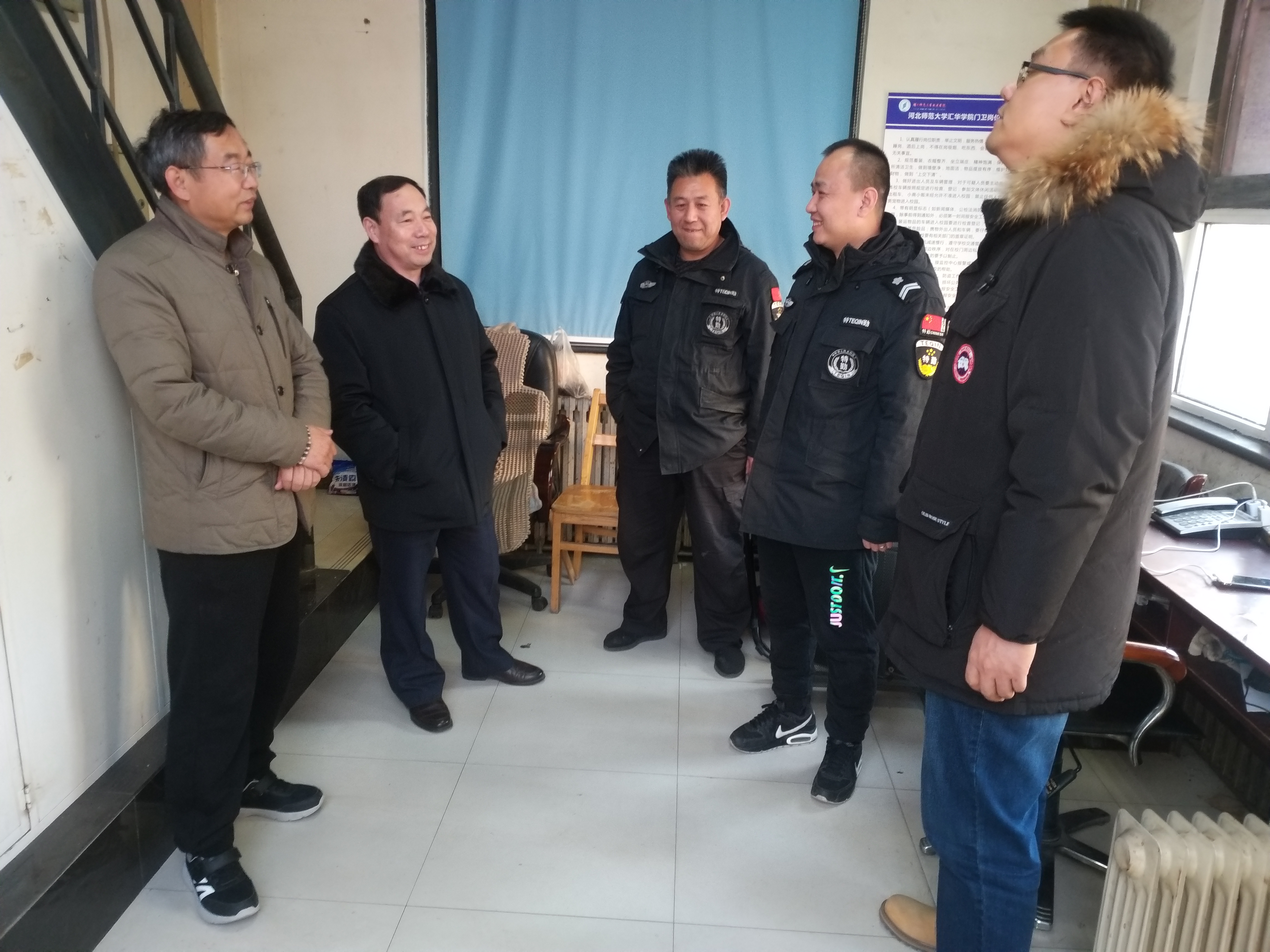 春节将至,岁寒情深,2月4日下午院长阎福玲、副院长崔建国带领安全工作处负责人、学院办公室和校卫队工作人员,深入视频监控管理中心、警卫室、值班室等地,走访慰问春节期间值守岗位的教职员工,为他们送去关怀温暖、新春祝福的同时全面检查了校园安全工作情况。