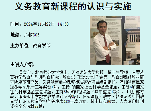 主讲人简介:吴立宝,北京师范大学博士,天津师范大学教授,博士生导师,主要从事数学教育与教师教育研究。教育部“国培计划”专家,教育部课程教材研究所兼职研究员,义务教育数学课程标准实验项目组副组长。基础教育国家级教学成果一二等奖各1项,主持1项国家社会科学基金课题,主研3项国家社会科学基金重点课题,主持5项省部级课题(其中重点1项)。出版1部专著,编著《中学数学教学设计》等8部,在《课程·教材·教法》《中国教育学刊》《教育学报》等发表180余篇论文,其中核心95篇,人大复印报刊资料全文转载22篇。